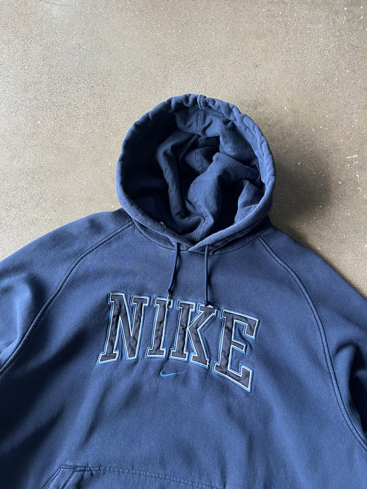 Vintage Navy Blue Nike Spellout Hoodie - L
